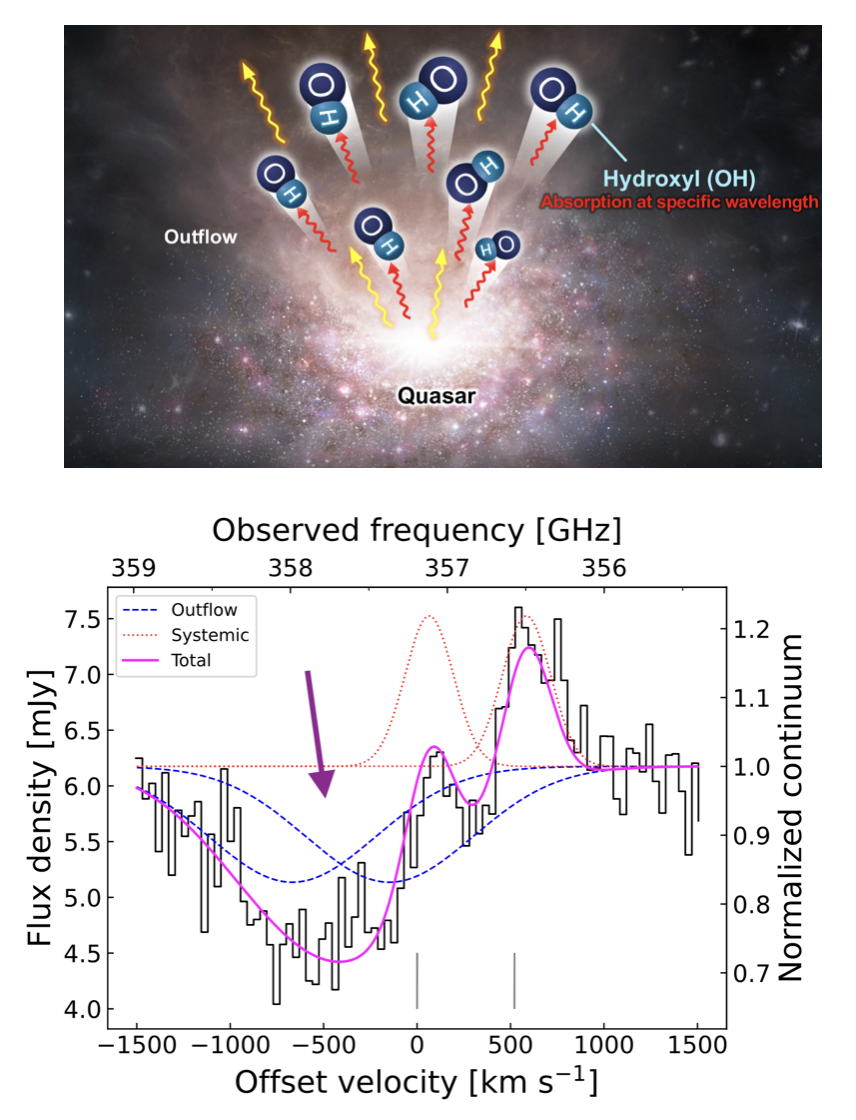 Infografica che rappresenta l’espulsione delle molecole di OH dal quasar (in alto). La freccia (in basso) indica l’assorbimento dovuto alle molecole di OH che fuoriescono dalla galassia che ospita il quasar. Crediti: Alma (Eso/Naoj/Nrao) modificato da D. Salak et al.; D. Salak et al., ApJ, 2024
