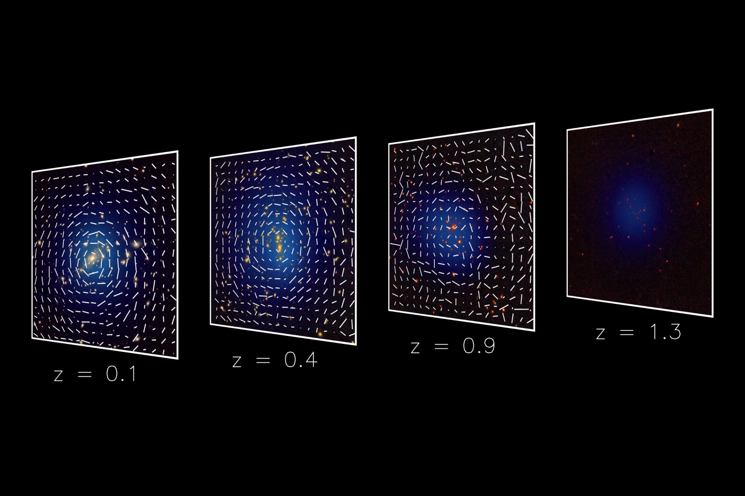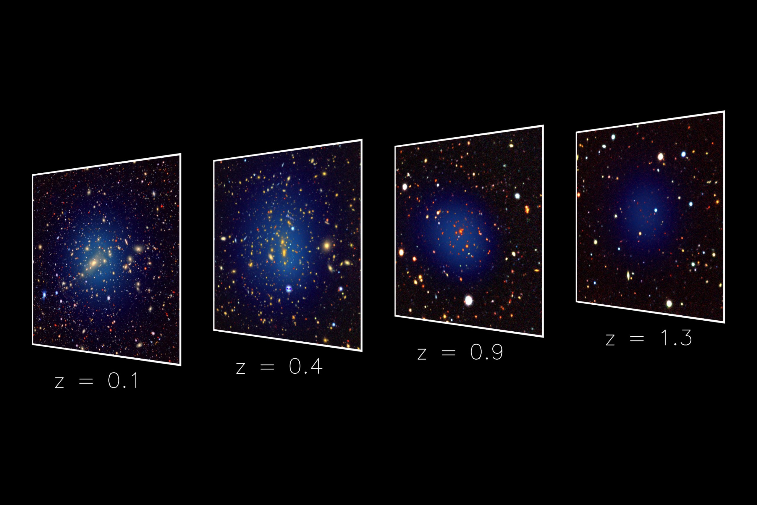 Immagini ottiche che mostrano le galassie in direzione di quattro ammassi di galassie a distanze diverse. L’emissione di raggi X del gas caldo negli ammassi è mostrata in blu. Crediti: M. Kluge, C. Garrel; optical image: Legacy Survey DR10, X-ray: eRosita