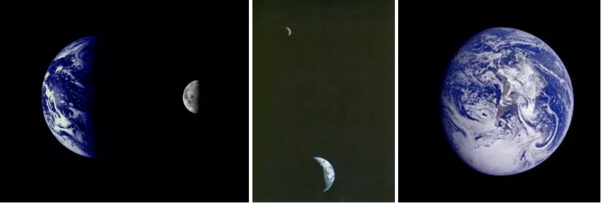 A sinistra: il mosaico di due immagini separate della Terra e della Luna, scattate da Mariner 10 nel 1973 mentre si dirigeva verso Venere e Mercurio. Al centro: la prima immagine del sistema Terra-Luna in un singolo fotogramma, ottenuto dalla sonda Voyager 1 nel 1977. A destra: la prima immagine della Terra scattata da una navicella spaziale interplanetaria, la sonda Galileo. Crediti: Nasa