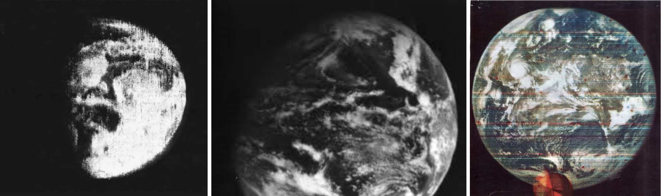 A sinistra: la prima fotografia dell’intero disco della Terra, scattata nel 1966 dal satellite per telecomunicazioni sovietico Molniya 1-3. Al centro: la prima immagine della Terra scatta dall’orbita geostazionaria, dal satellite Advanced Technology Satellite-1. A destra: la prima immagine a colori dell’intera Terra ottenuta dal satellite Dodge. Crediti: Nasa