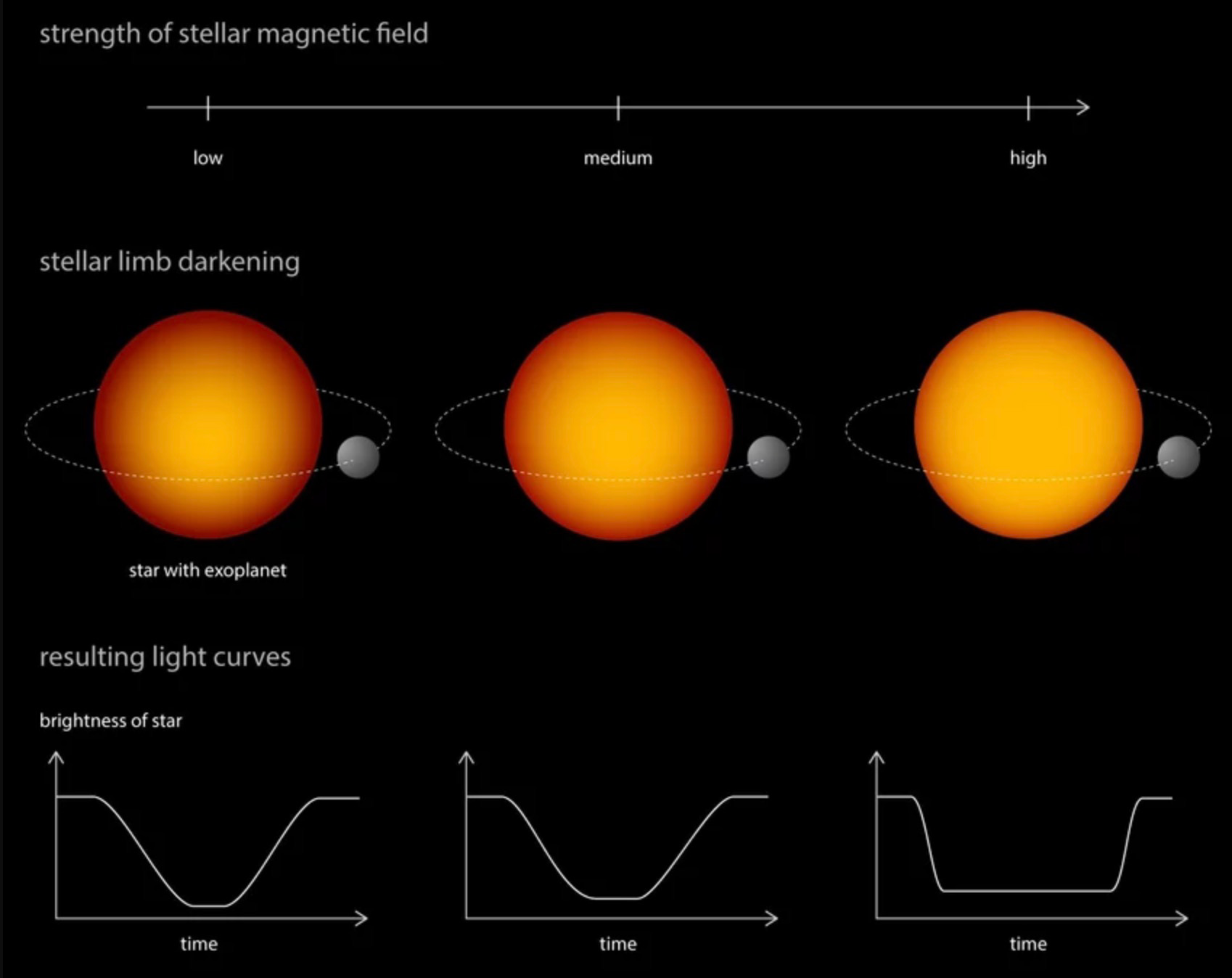 Il fenomeno dell’oscuramento al bordo influisce sulla forma esatta del segnale del transito dell’esopianeta nella curva di luce: l’estensione dell’oscuramento determina infatti quanto ripidamente la luminosità di una stella diminuisce durante un transito planetario. Tuttavia, come dicevamo, non è stato possibile riprodurre accuratamente i dati osservativi utilizzando i modelli convenzionali dell’atmosfera stellare. Tenendo però conto, nei modelli, del campo magnetico è stato possibile osservare un effetto importante: l’oscuramento è più pronunciato nelle stelle con un campo magnetico debole, mentre è più debole in quelle con un campo magnetico forte.