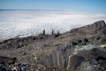 Claire Nichols e colleghi sullo sperone di una formazione di ferro a bande. Sullo sfondo la calotta di ghiaccio della Groenlandia. Crediti: Claire Nichols
