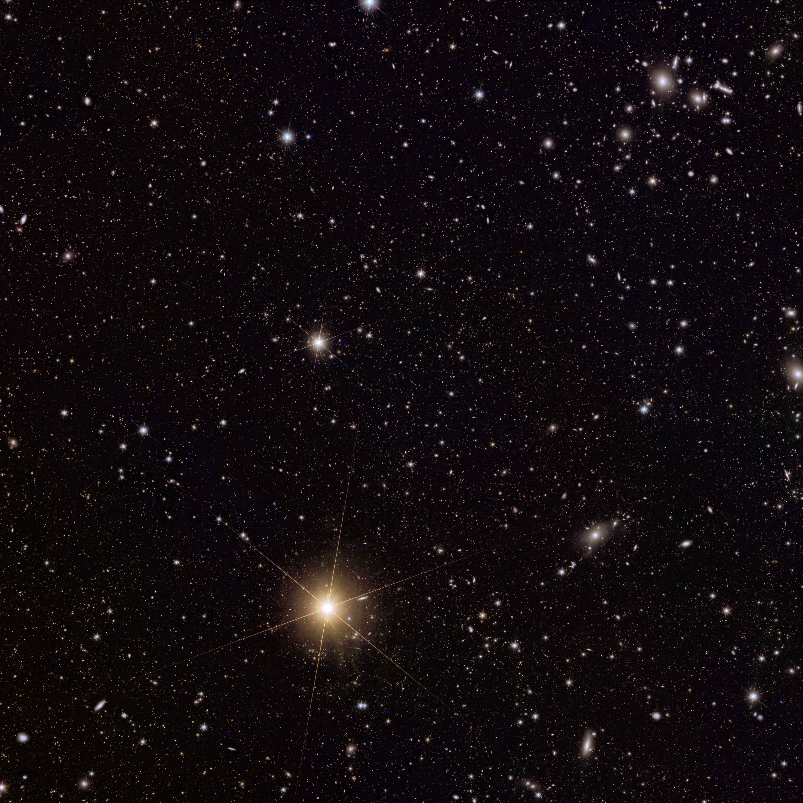 L’ammasso di galassie Abell 2764 (in alto a destra), con centinaia di galassie all’interno di un vasto alone di materia oscura a circa un miliardo di anni luce da noi. In primo piano si vede anche V*BP-Phoenicis, una stella molto luminosa dell’emisfero meridionale. Crediti: Esa/Euclid/Euclid Consortium/Nasa – Cc By-Sa 3.0 Igo