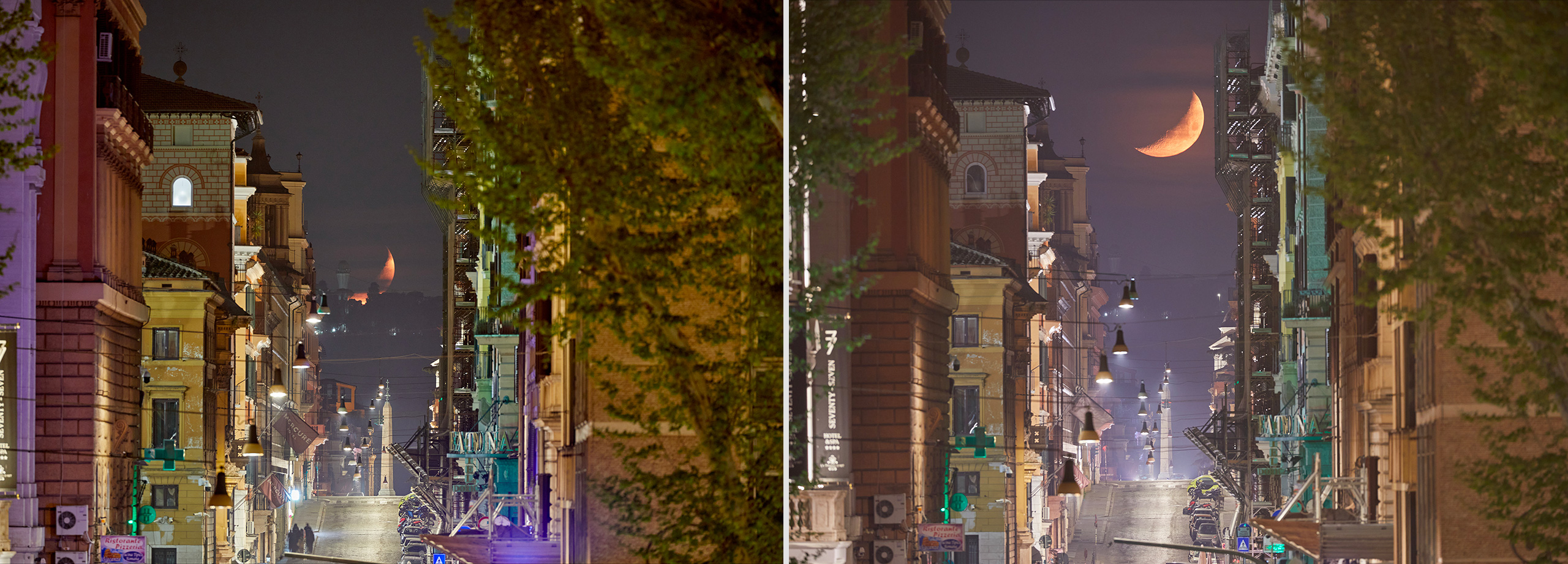 Tramonto della Luna lungo l’Asse sistino al lunistizio superiore visto da Piazza Esquilino il 14 (a sinistra) e il 13 (a destra) aprile 2024. L’azimut del punto di scomparsa cambia leggermente da una notte all’altra. Crediti: Gianluca Masi, Virtual Telescope Project/Inaf