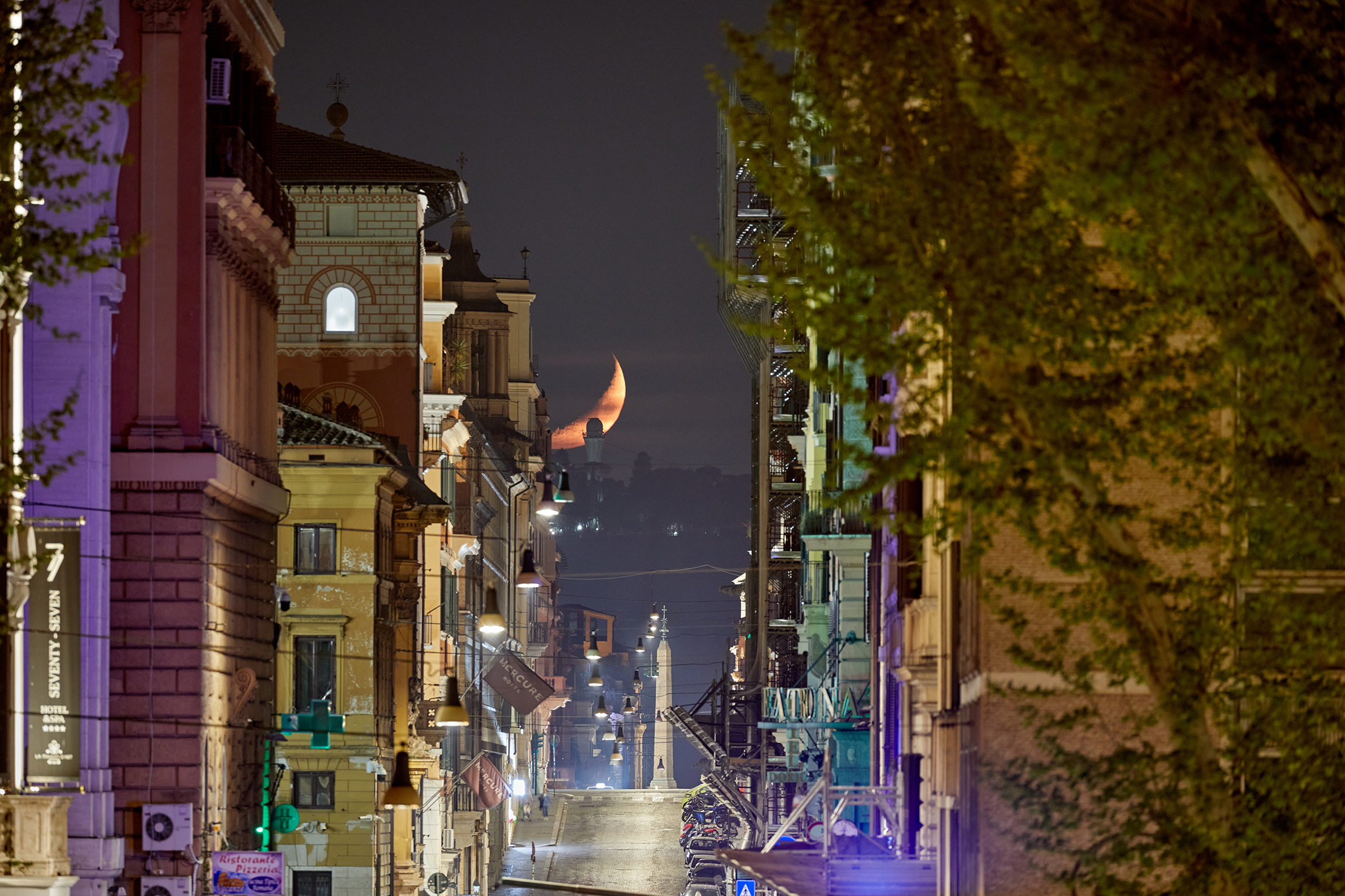Questo ci raccontano queste splendide foto del nostro satellite naturale che si prepara a scomparire all’orizzonte in uno dei più famosi rettilinei di Roma, composto da via Depretis, via Quattro Fontane e via Sistina.