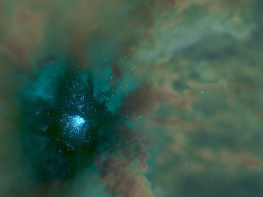 Ammasso stellare in formazione in una nube molecolare gigante riprodotta dalla simulazione. Crediti: Takaaki Takeda (Vasa Entertainment Inc.)