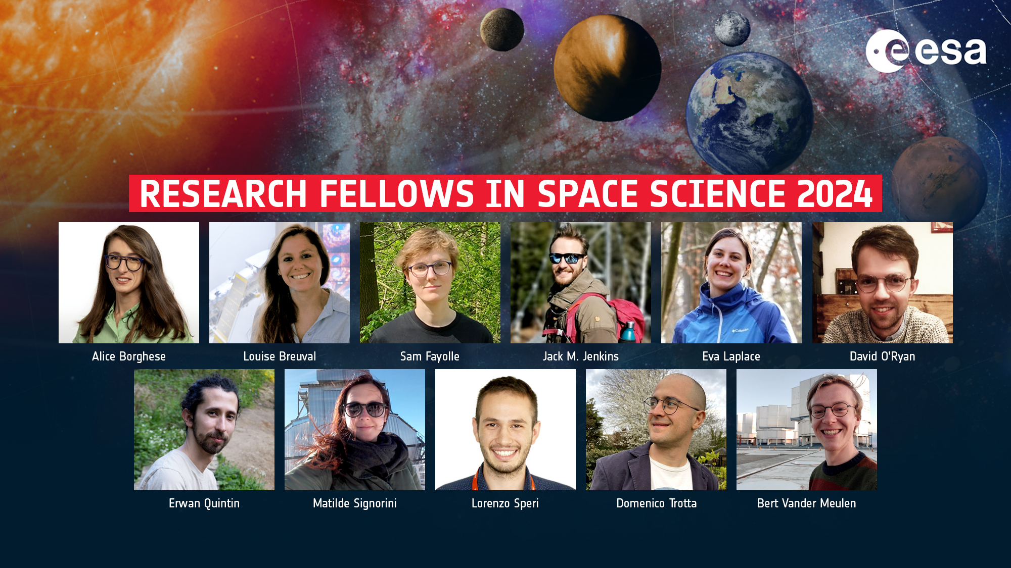 Gli undici vincitori della borsa di studio Esa 2024: Alice Borghese, Louise Breuval, Sam Fayolle, Jack M. Jenkins, Eva Laplace, David O’Ryan, Erwan Quintin, Matilde Signorini, Lorenzo Speri, Domenico Trotta, and Bert Vander Meulen. Crediti: Esa.