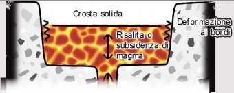 In questo grafico, il meccanismo proposto per la formazione dell’anello di lava: la risalita e ridiscesa del magma provoca la rottura della crosta sui bordi del lago. Crediti: A. Mura
