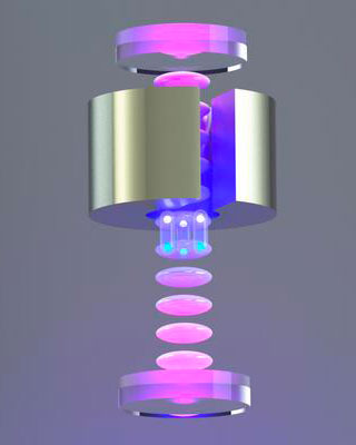 In questa fotografia si vedono raggruppamenti di circa diecimila atomi di cesio fluttuare in una camera a vuoto, levitati da fasci laser incrociati che creano un reticolo ottico stabile. In alto sono visibili un peso cilindrico di tungsteno e il suo supporto. Crediti: Cristian Panda, Uc Berkeley