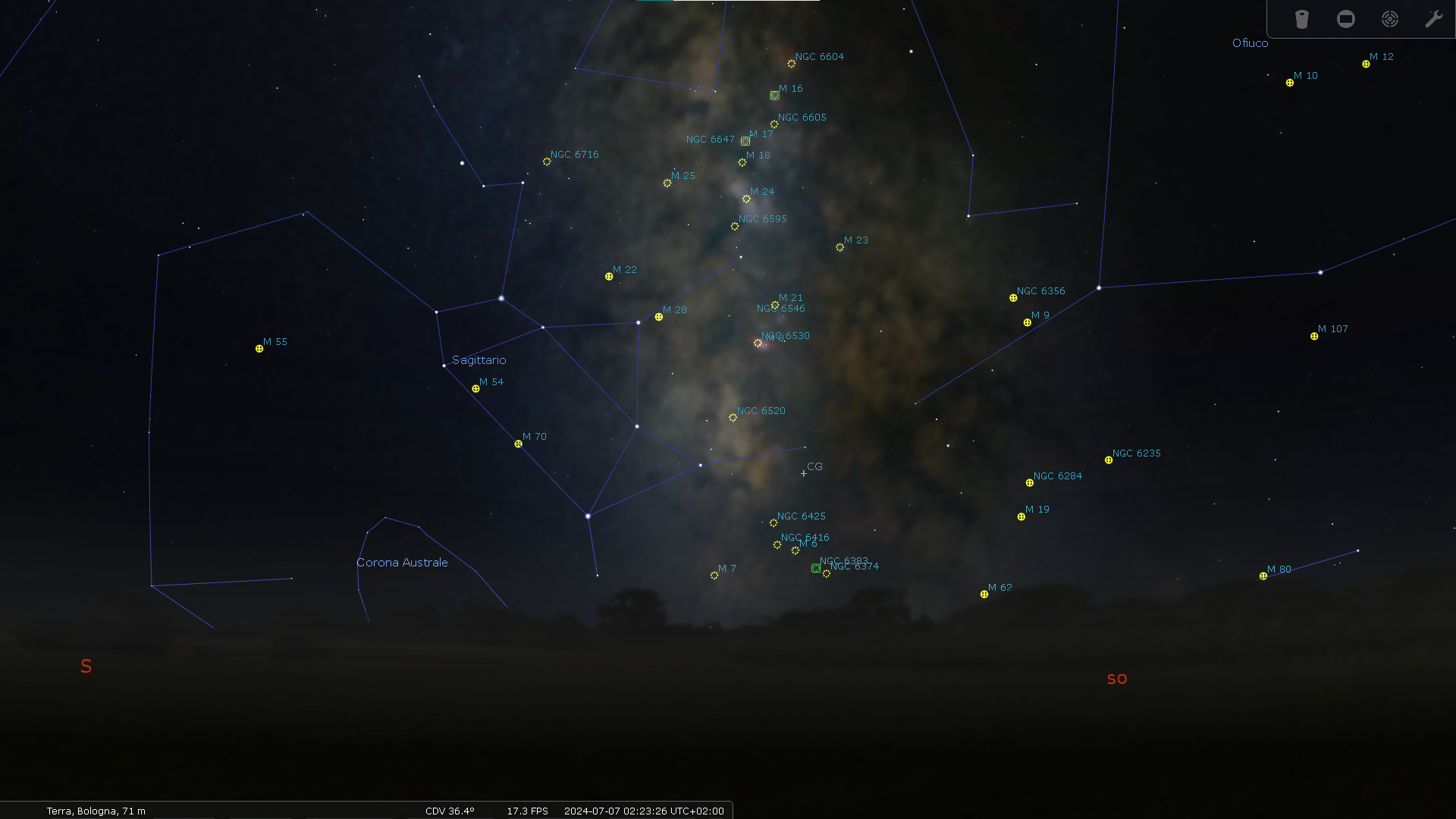 La zona di cielo intorno al centro galattico è uno spettacolo di ammassi globulari, ammassi aperti, nebulose e regioni oscure della galassia. Alcuni, e nemmeno pochi, almeno limitatamente agli oggetti di Messier, sono ben visibili con un binocolo. Se ne avete uno scegliete un posto lontano da luci cittadine, puntate a caso verso il Sagittario e lo Scorpione, verso Sud Sud-Ovest, a notte fonda e osserverete tanti sbuffi di luce fioca che ci proiettano fuori dal Sistema solare verso il centro galattico. Tra i vari oggetti da osservare, due sono particolarmente belli: la Nebulosa Laguna (M8) e, poco più in alto, la Nebulosa Trifida (M20). Entrambe le nebulose sono visibili con un binocolo. Addirittura, M8 è visibile anche a occhio nudo.