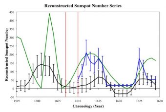 Come potete vedere dal grafico sopra, la serie di dati acquisita dal 1610 in poi indica una transizione graduale tra i cicli solari regolari e il minimo di Maunder. Le osservazioni al telescopio delle macchie solari non hanno colto l’inizio del ciclo solare riportato nel grafico, il numero -13 (dove il segno meno si deve al fatto che il ciclo solare numero 1 è quello cominciato nel 1755, e che quindi ai precedenti è stato assegnato un valore negativo), lasciando spazio a una notevole incertezza sulla sua evoluzione temporale.