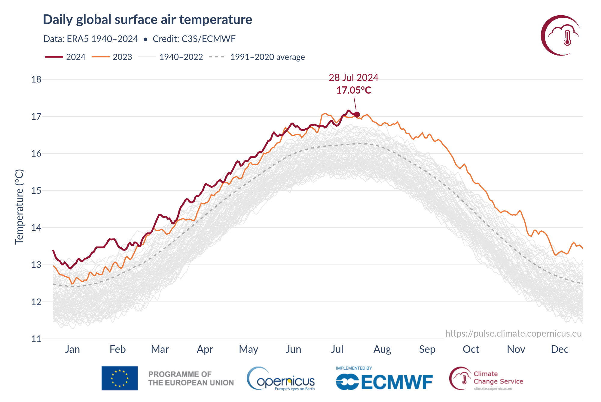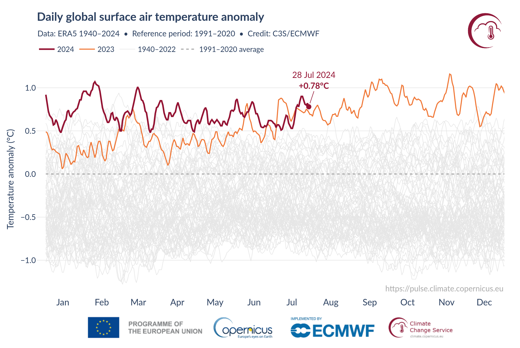 Il grafico che vedete riportato sulla destra raccoglie i dati di una rianalisi climatica di Era5 da parte del Centro europeo per le previsioni meteorologiche a medio termine (o European Centre for Medium-Range Weather Forecasts, Ecmwf) per il programma Copernicus Climate Change Service (C3S). Il grafico mostra la temperatura globale media dell’aria a due metri dal suolo relativa all’anno in corso (rosso scuro), al 2023 (arancio) e al periodo 1991-2020. È evidente anche a una prima occhiata come le rilevazioni degli ultimi due anni si collochino nettamente sopra la media degli ultimi trenta.