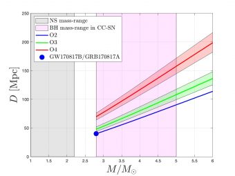 Distanze dell’orizzonte in funzione della massa di buchi neri inizialmente in rapida rotazione mediante mass-scaling di Gw 170817B/Grb 170817A (punto blu) e miglioramento del rilevatore in O4 rispetto a O2. È evidenziato l’intervallo di massa previsto dei buchi neri prodotti in Cc-Sne energetiche (magenta). Crediti: Maurice H.P.M. van Putten et al., ApJL, 2024