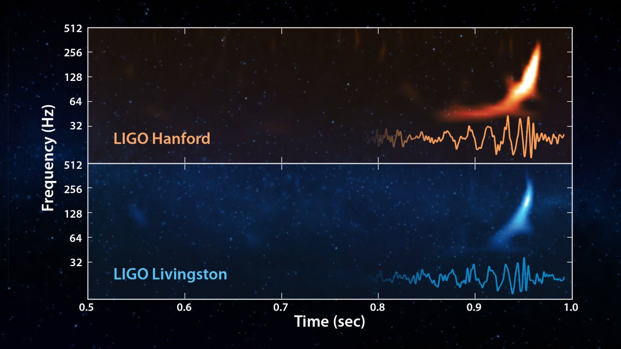 Qui sopra, il chirp ascendente caratteristico della fusione di due oggetti compatti. La perdita di velocità di rotazione di un singolo oggetto compatto avrebbe invece come firma gravitazionale caratteristica un chirp discendente. Crediti: Ligo Collaboration