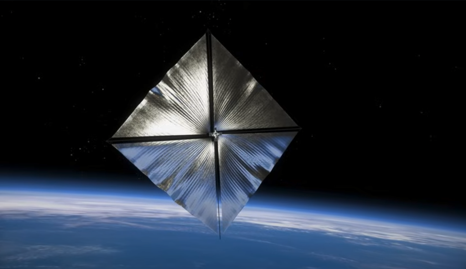 La vela solare nella prima foto scattata dal satellite al quale è ancorata. Nella parte inferiore dell’immagine si vede la superficie brillante dei 4 quadranti in cui è suddivisa la vela. Crediti: Nasa, via X