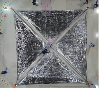 Ingegneri del Langley Research Center della NASA testano il dispiegamento della vela solare dell’Advanced Composite Solar Sail System. La vela solare spiegata misura circa 9 metri di lato. Poiché la pressione della radiazione solare è piccola, la vela solare deve essere grande per generare una spinta propulsiva efficiente. Crediti: Nasa