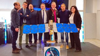 La consegna del cubesat Milani, lo scorso marzo, presso l’azienda Tyvak International Srl a Torino. Da sinistra: Andrea Longobardo (Inaf Iaps, team Vista), Diego Scaccabarozzi (Politecnico di Milano), Emiliano Zampetti (Cnr), Ian Carnelli (project manager della missione Hera), Ernesto Palomba (Inaf Iaps, responsabile scientifico dello strumento Vista), Fabrizio Dirri (Inaf Iaps, team Vista), Chiara Gisellu (Inaf Iaps, team Vista). Crediti: C. Gisellu
