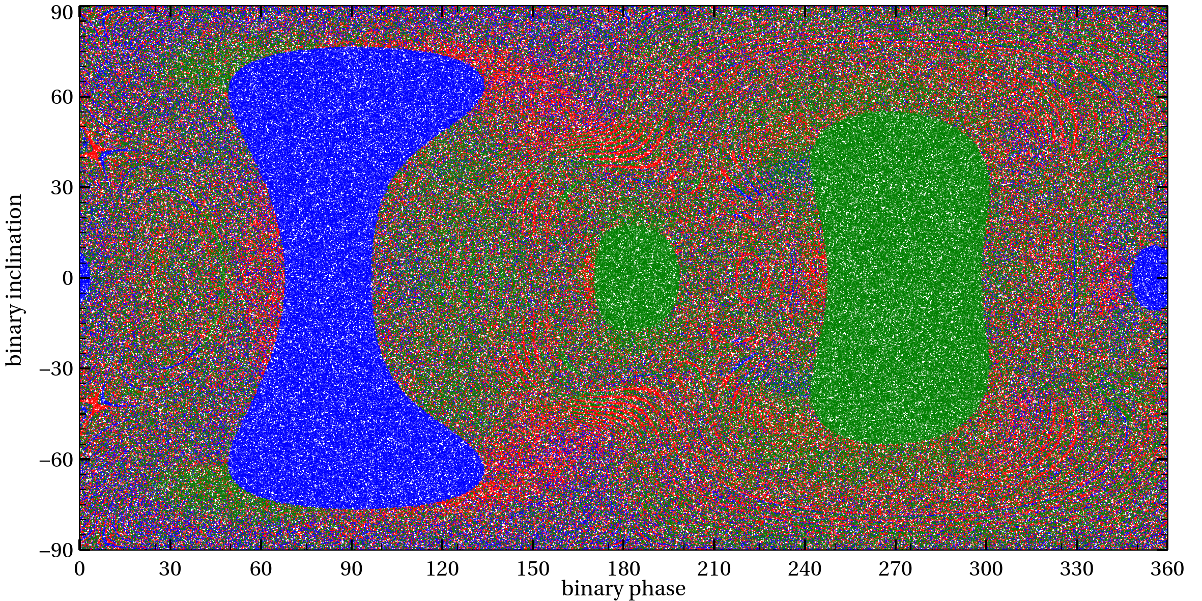 Questo è solo uno degli innumerevoli possibili esiti. Nell’immagine qui sotto sono raccolti tutti gli esiti simulati. In orizzontale la fase iniziale della binaria, in verticale l’angolo di ingresso dell’intruso e nell’area interna, appunto, gli esiti, rappresentati da milioni di punti con il colore della particella espulsa – in rosso se è stata quella da 12.5 masse solari, in blu quella da 15 e in verde quella da 17.5. Ciò che subito salta agli occhi è che i punti colorati non sono distribuiti in modo del tutto caotico: alcune forme emergono in modo molto netto. Sono quelle che Trani chiama “isole di regolarità”.