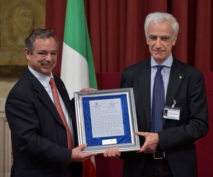 Marco Tavani (a dx), presidente Inaf dal 2020 al 2024, riceve il premio “Luigi Broglio” dal preside della Scuola di ingegneria aerospaziale della Sapienza, Giovanni Palmerini (a sx)