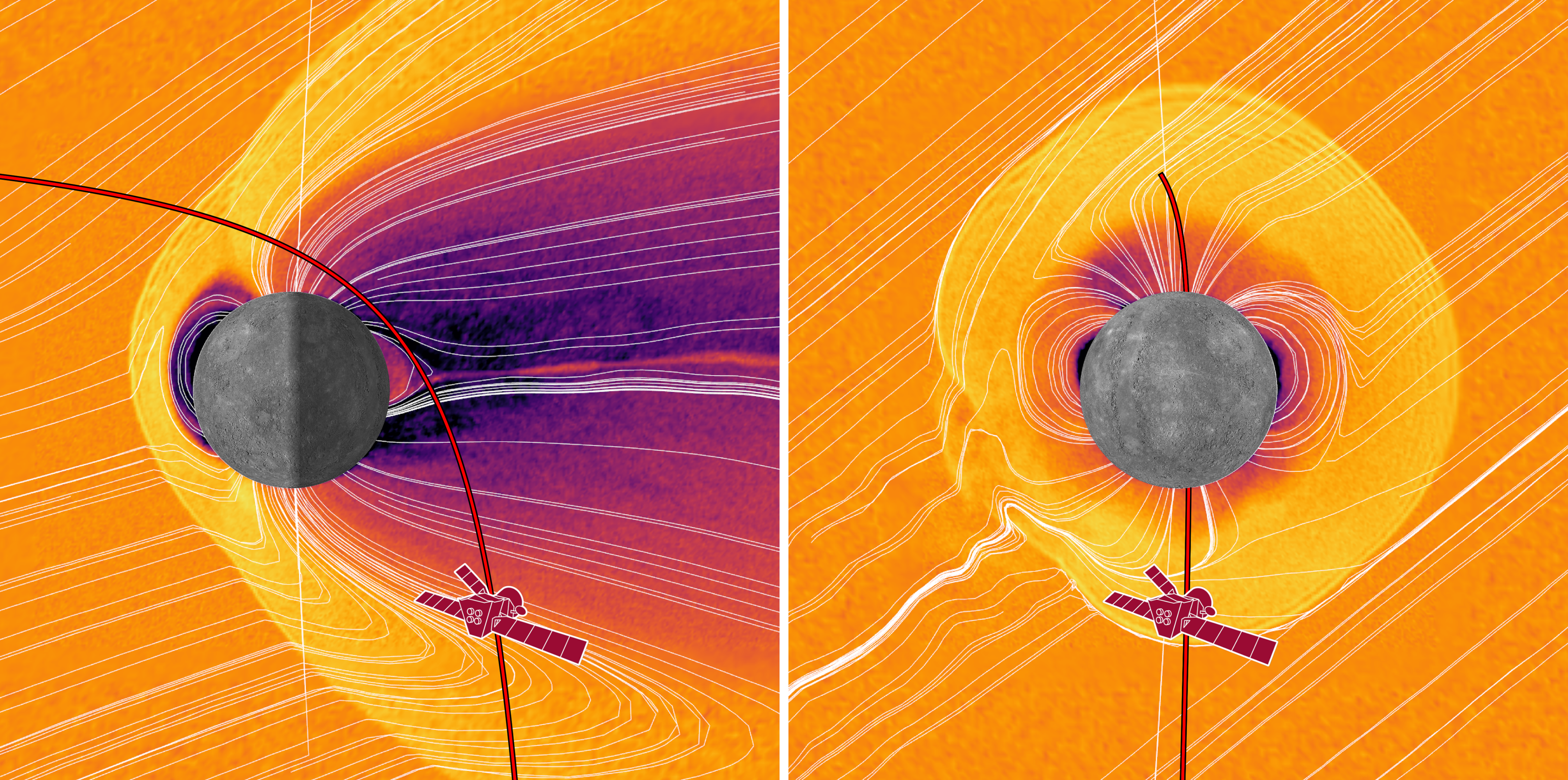 Il campo magnetico di Mercurio interagisce con le particelle del vento solare, creando la magnetosfera del pianeta, una bolla nello spazio che ha la forma di una coperta di vento che si estende lontano dal Sole. Questa bolla cambia costantemente in risposta al vento solare. Qui vedete il risultato di una simulazione che illustra un possibile ambiente magnetico di Mercurio in condizioni tipiche di vento solare. L’immagine di sinistra mostra una “vista laterale” in cui il Sole è fuori dal campo a sinistra; l’immagine di destra mostra una “vista frontale” come se stessimo guardando Mercurio dalla direzione del Sole. La simulazione si basa su un modello, non mostra osservazioni reali. I colori indicano la densità delle particelle cariche intorno a Mercurio, con la densità più alta in giallo e quella più bassa in viola/nero. Le linee bianche sono linee di campo magnetico (le linee quasi verticali che si estendono dai poli del pianeta sono artefatti numerici e vanno ignorate). Il vento solare indisturbato appare di colore arancione scuro. Quando il vento solare incontra il campo magnetico di Mercurio, viene riscaldato e deviato, creando una regione più densa di particelle di vento solare, indicata in giallo. All’interno di questo strato denso, vediamo che il numero di particelle di vento solare scende molto rapidamente fino a quasi zero, a eccezione di un flusso che si estende dall’equatore. Crediti: Willi Exner – Esa & Tu Braunschweig