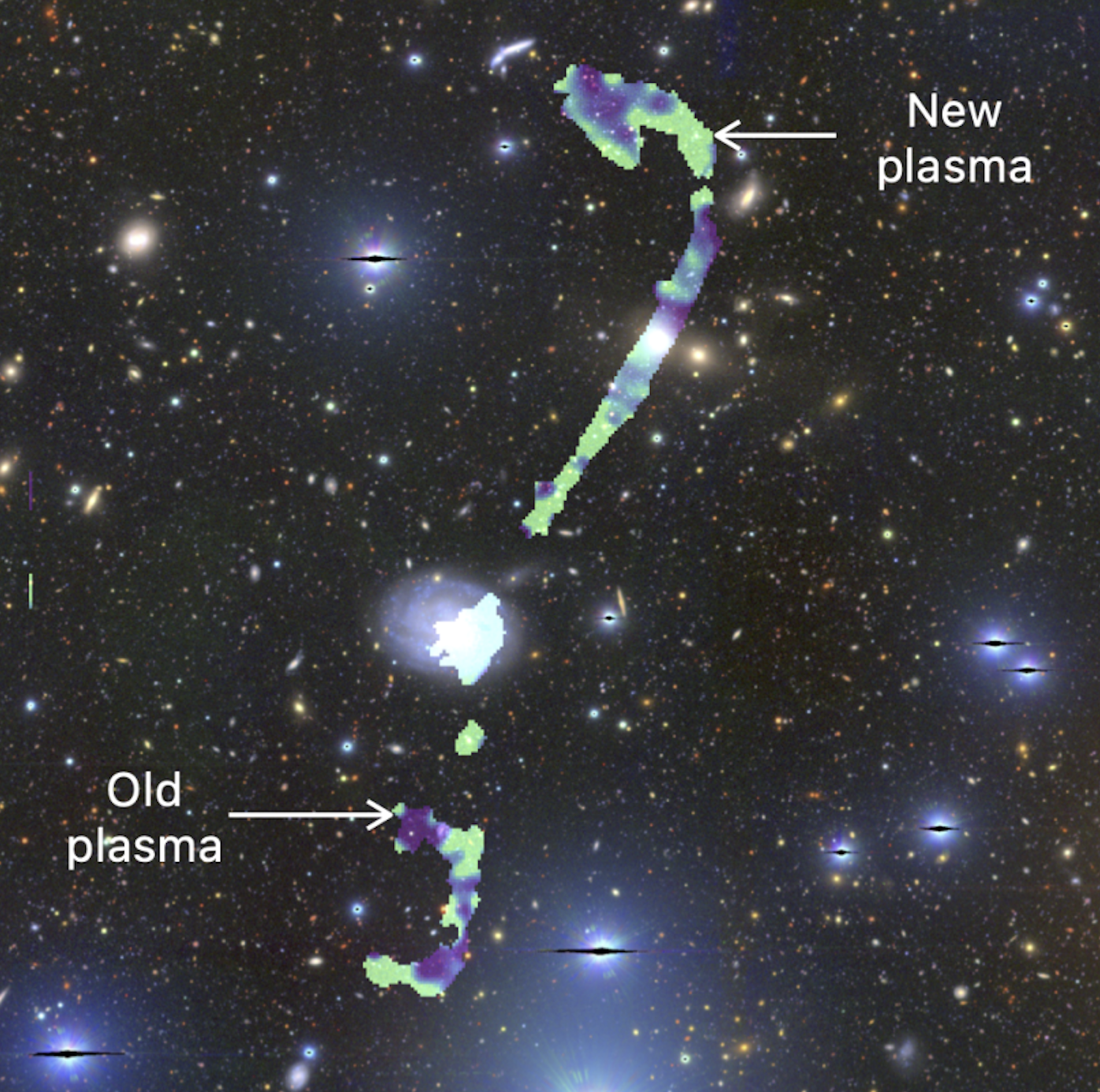 Mappa dell’età degli elettroni nei getti di plasma. Gli elettroni più “giovani” – ovvero, riaccelerati di recente – sono rappresentati in verde. In viola invece troviamo il plasma più “vecchio”, che non ha subito una riaccelerazione ad opera di fenomeni energetici. Crediti: K. K. L Charlton (Uct), MeerKat, Hsc, Carta, Idia