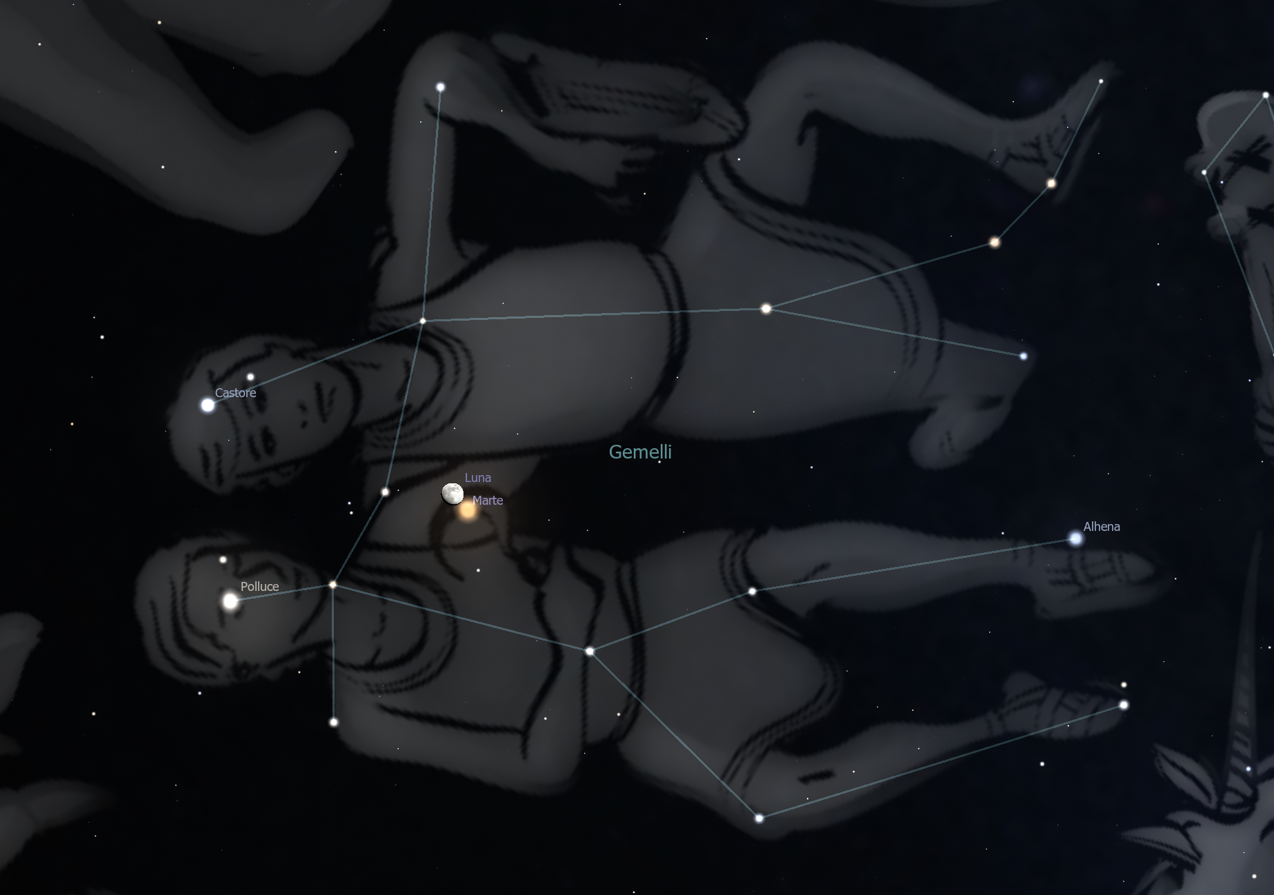 Marte e la Luna nella costellazione dei Gemelli, visibili la sera del 9 febbraio. Simulazione con software Stellarium
