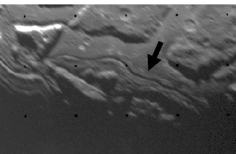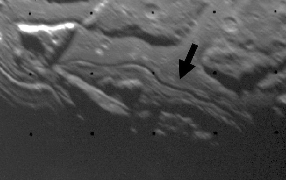 Immagine della superficie di Ariel che mostra il dettaglio di un solco mediale (contrassegnato dalla freccia nera). Crediti: Nasa/Jet Propulsion Laboratory