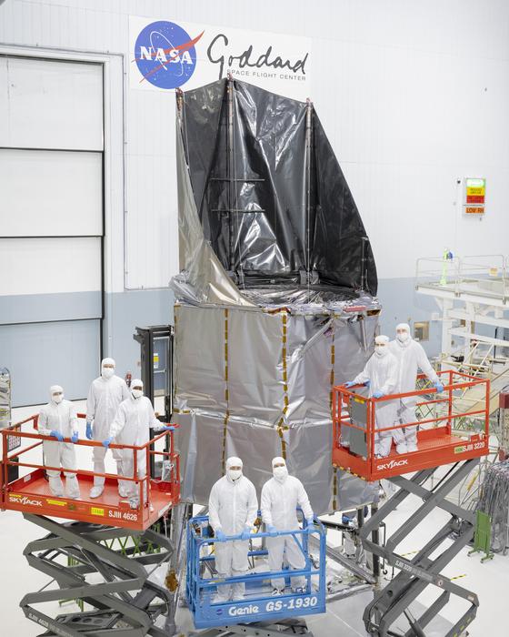 I tecnici del Goddard Space Flight Center della Nasa accanto al sistema parasole-esoscheletro del telescopio spaziale Nancy Grace Roman. Crediti: Nasa/Chris Gunn
