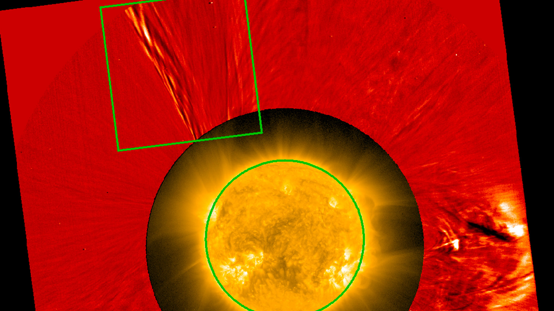 Immagine in luce visibile ottenuta dal coronografo Metis il 12 ottobre 2022, durante il passaggio al perielio della sonda Solar Orbiter. Al centro del campo di vista, il Sole ripreso dallo strumento Eui nella lunghezza d’onda di 174 ångstrom. Il riquadro giallo ritrae la struttura elicoidale oggetto dello studio. Crediti: Metis ed Eui (Solar Orbiter/Esa). L’immagine è stata realizzata da Vincenzo Andretta (Inaf di Napoli)