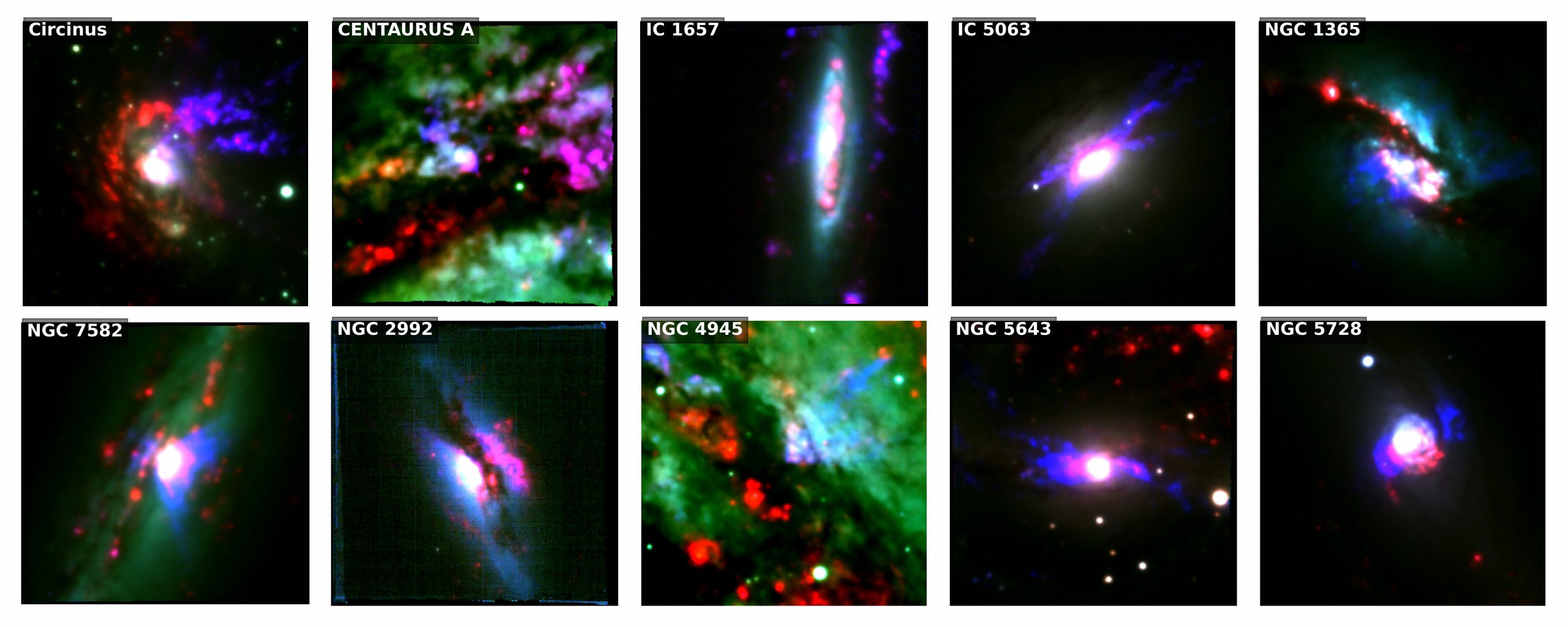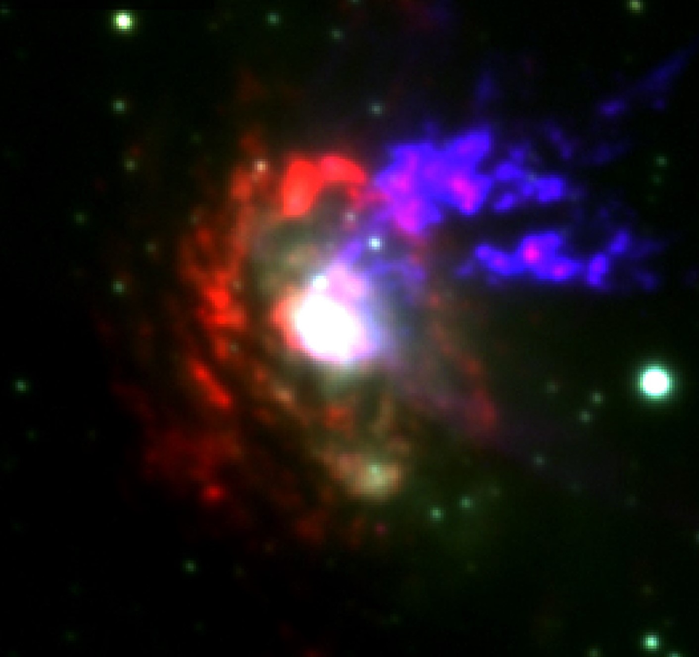 La galassia Circinus in un’immagine Rgb (o a falsi colori) in cui si evidenzia l’emissione di componenti diversi della galassia. In blu, il gas ionizzato che traccia i venti emessi dai buchi neri; in rosso, l’emissione da parte di stelle giovani e parzialmente anche i venti provenienti dai buchi neri; in verde, l’emissione diffusa delle stelle nella galassia. Crediti: Marconcini et al./Nature Astronomy/Vlt/Eso