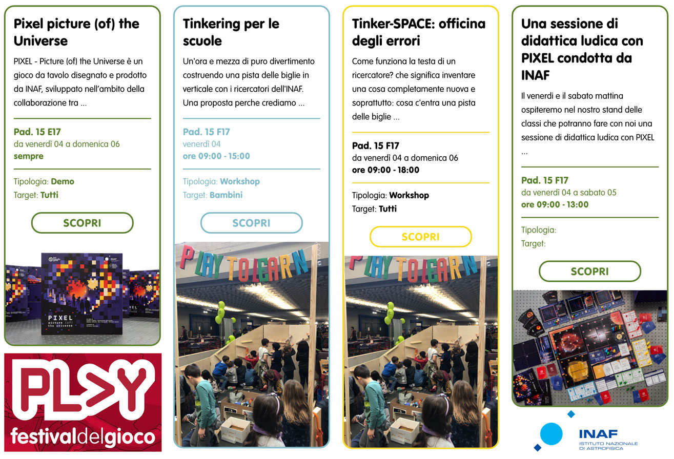 Tra gli ospiti del Festival più attesi spicca Phil Eklund, ingegnere aerospaziale oltre che game designer fra i più originali e celebrati al mondo. Sabato 5 aprile alle 15:00 l’Inaf spera di averlo nel proprio stand (padiglione 15 – E17) in occasione della presentazione di Pixel – Picture (of) the Universe. Pixel è un gioco strategico competitivo in cui i giocatori assumono il ruolo di direttori di centri di ricerca astrofisica, ciascuno impegnato a costruire prestigio scientifico. Il gioco, ideato insieme al direttore artistico di Play Andrea Ligabue dal gruppo di lavoro dell’Inaf dedicato al gioco, unisce una meccanica centrale e originale ispirata alla risoluzione delle immagini in astrofisica e inoltre rende le dinamiche sociali e istituzionali della ricerca scientifica reale attraverso la gestione delle risorse. Pur essendo principalmente competitivo, il gioco include anche alcuni elementi cooperativi, come l’utilizzo condiviso di un telescopio spaziale.