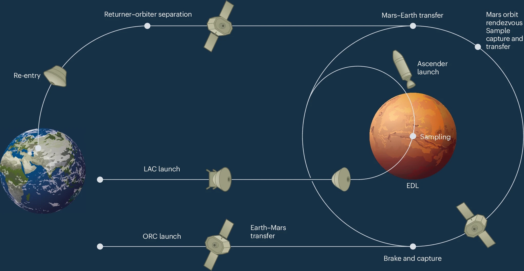 Ecco i principali passaggi della missione: una volta sulla superficie marziana, il lander acquisirà campioni di superficie con un braccio robotico, mentre un trapano in grado di raggiungere i due metri di profondità preleverà campioni dal sottosuolo. A supporto delle operazioni, come detto, ci sarà un piccolo aeromobile, che servirà per il campionamento di rocce in aree più distanti. I campioni raccolti saranno quindi confezionati e caricati sul veicolo di risalita posto nella parte superiore del lander. Dopo alcuni mesi trascorsi su Marte, comincerà la seconda fase della missione: il ritorno dei campioni. In questa fase, il veicolo di risalita decollerà dal dorso del lander, trasferendo i campioni al veicolo di ritorno posto in orbita, che infine li riporterà sulla Terra.