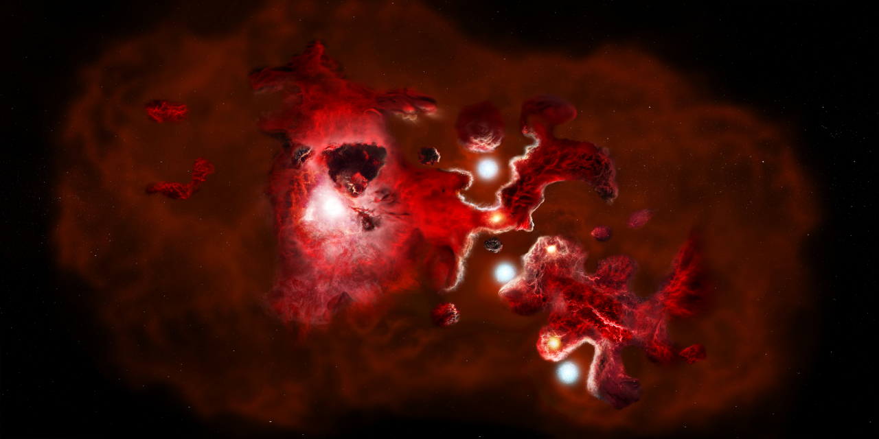 Illustrazione di una galassia del programma Cristal, un miliardo di anni dopo il Big Bang. Le stelle si formano all’interno di nubi distinte. Il gas freddo, che alimenta la formazione stellare e tracciato dalla riga del carbonio ionizzato ([CII]), è rappresentato in rosso mentre la polvere calda, scaldata dalle stelle appena nate, è mostrata in nero. Crediti: Nsf, Aui, Nsf Nrao, B. Saxton