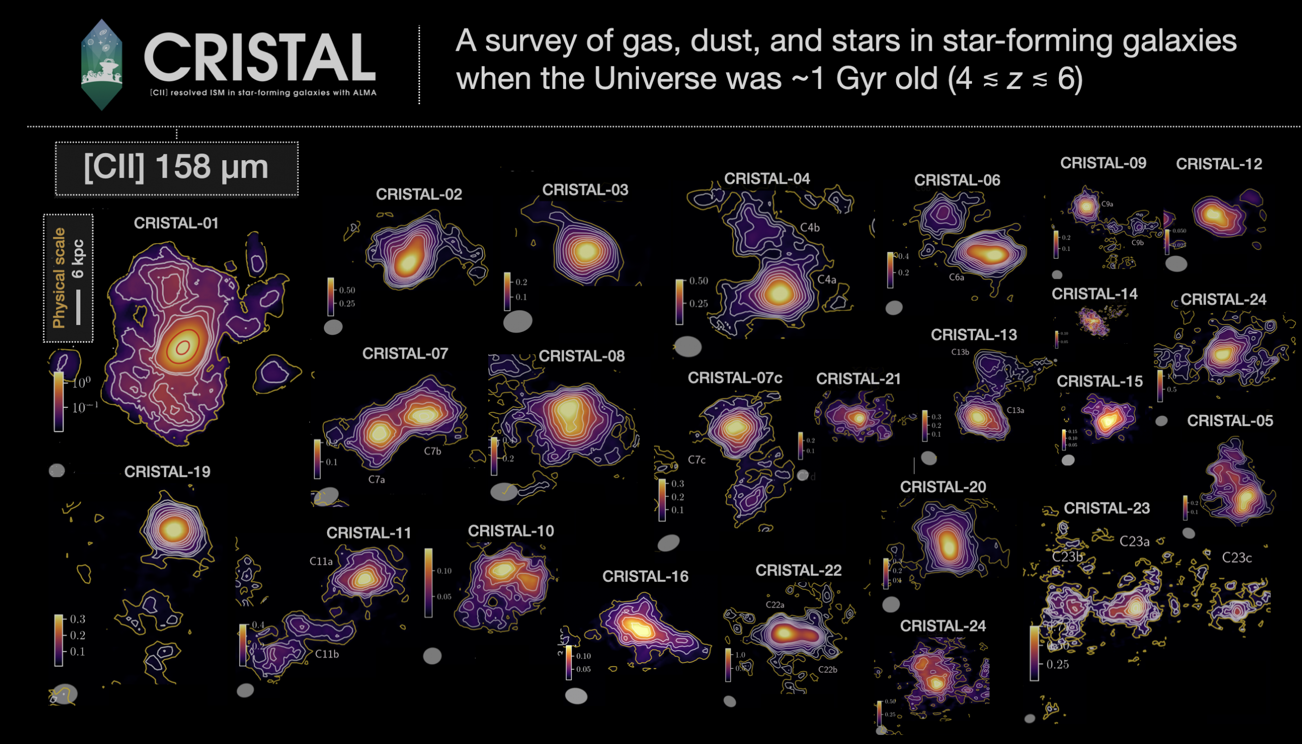 L’emissione del carbonio ionizzato nelle galassie del programma Cristal. Le mappe ad alta risoluzione ottenute da Alma consentono di studiare nel dettaglio la morfologia, l’estensione e i moti del gas freddo. Crediti: Cristal large program