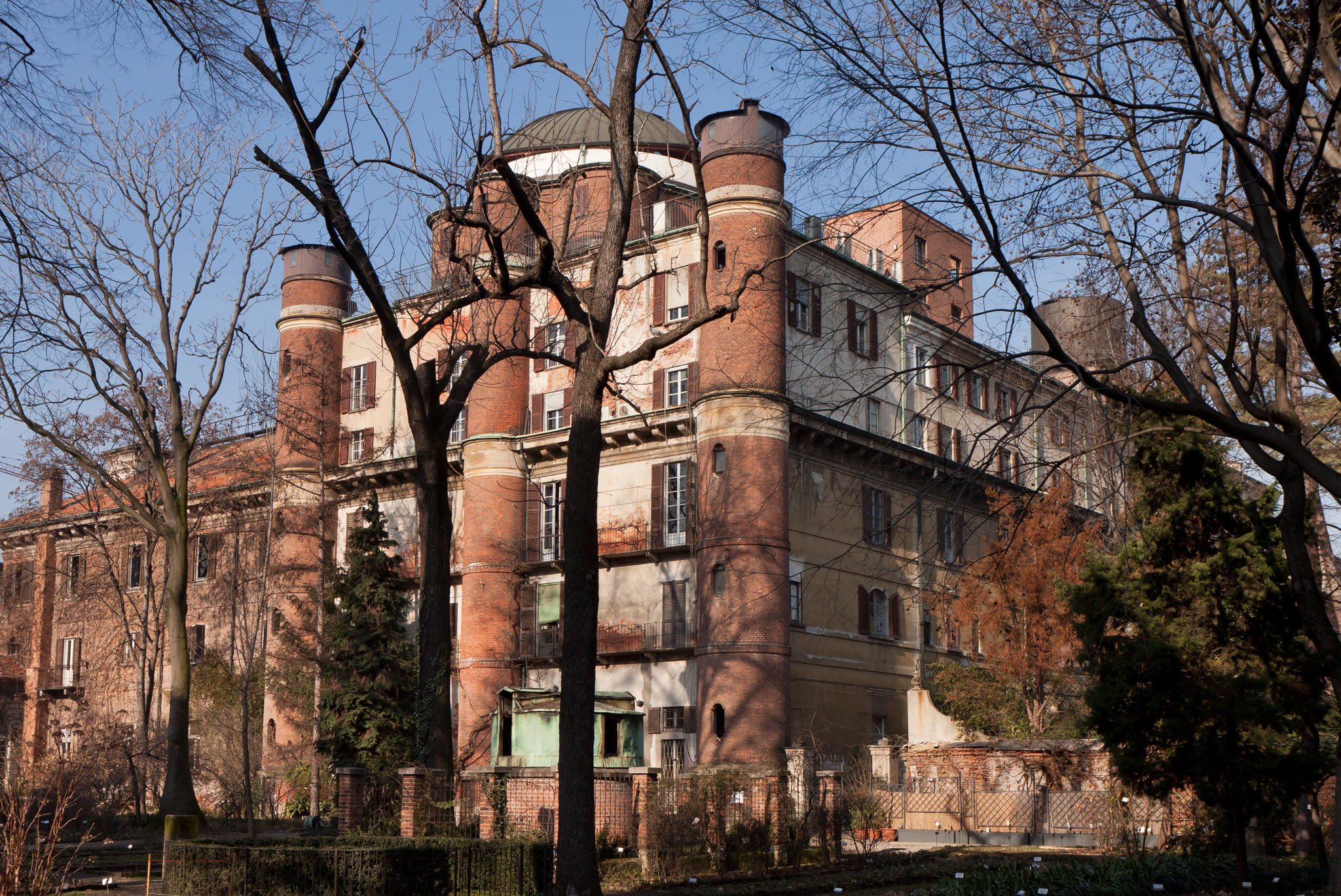 Veduta della facciata meridionale del palazzo dove si trova l’Osservatorio astronomico di Brera a Milano, alla cui sommità è situata la cupola a fiore, vista dall’Orto Botanico di Brera. Immagine ripresa con cavalletto e filtro Uv Hoya Pro1 Digital. Crediti: Inaf Oa Brera