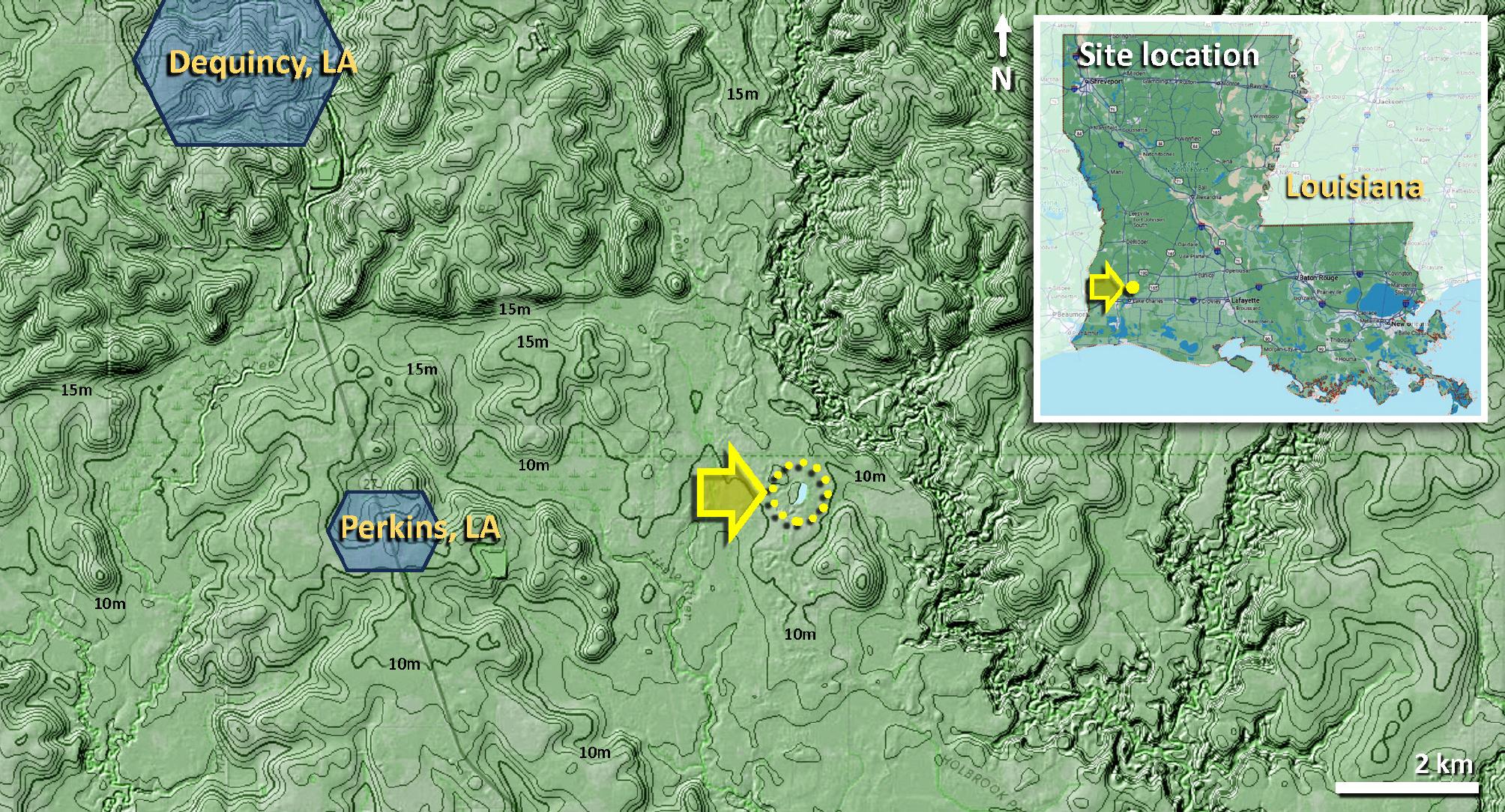 Nella mappa viene indicata la posizione del lago a est di Perkins, in Lousiana, che potrebbe costituire il cratere da impatto di un frammento di cometa. Crediti: Usgs, Google Maps, 2024, Inegi, Fitzenreiter et al.