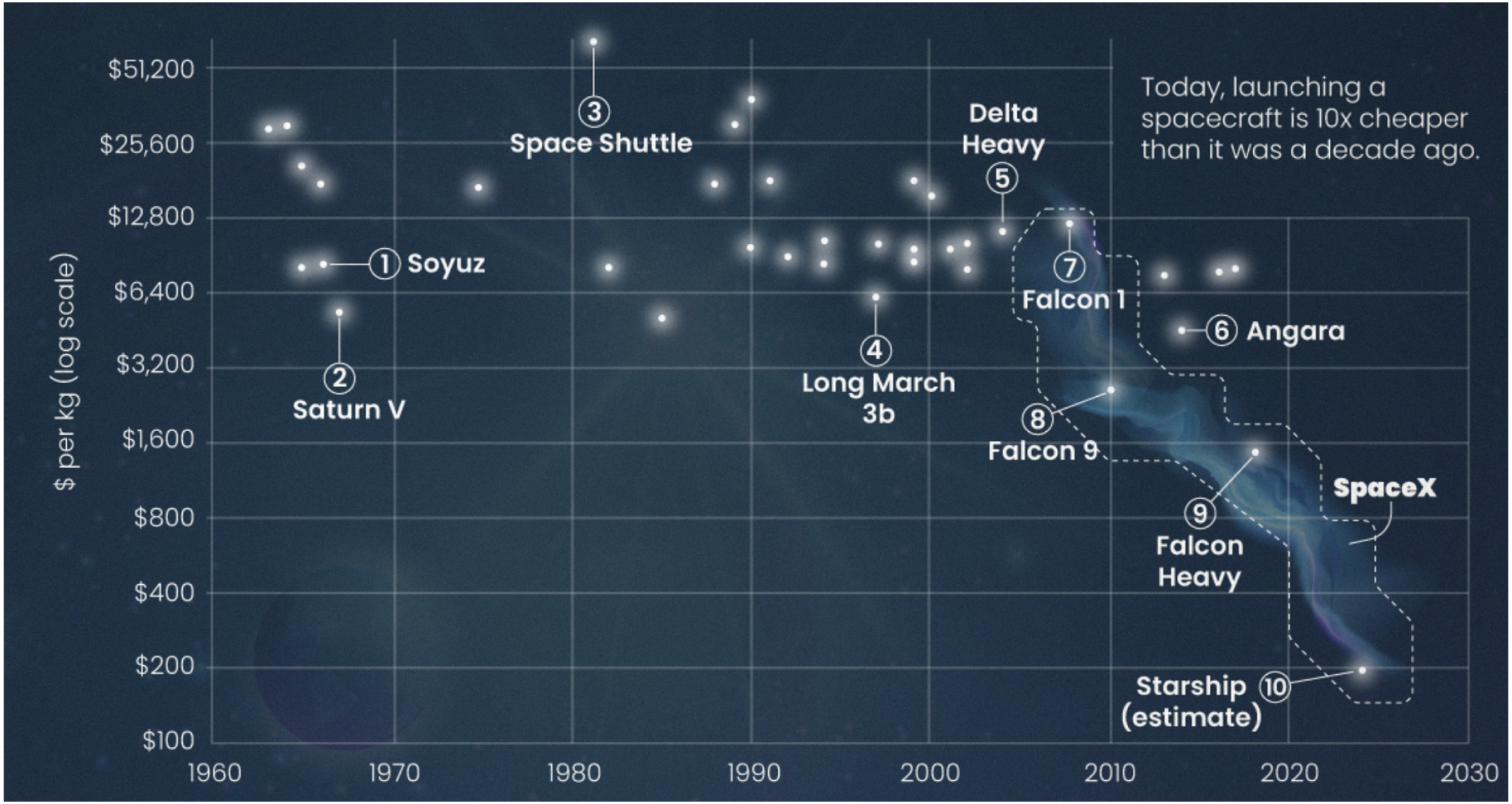 Evoluzione nel tempo del costo di lancio per kg di payload verso l’orbita terrestre bassa. Crediti: F. Fiore & M. Elvis, Space Policy, 2025