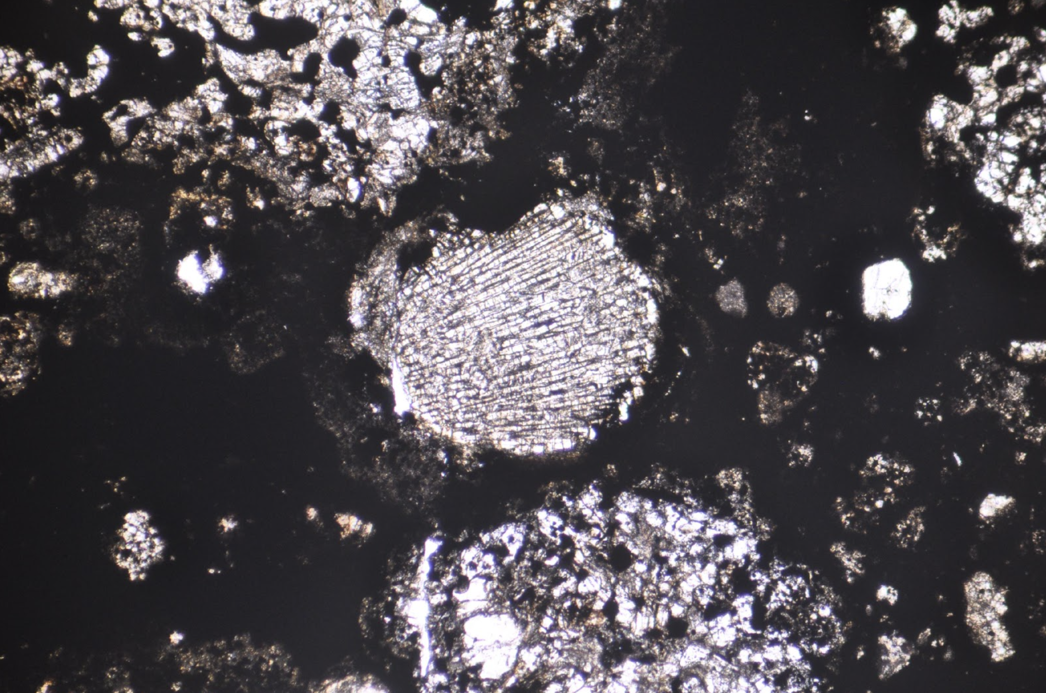Condrule tonde visibili in una sezione sottile del meteorite Allende al microscopio. Crediti: Akira Miyake, Università di Kyoto