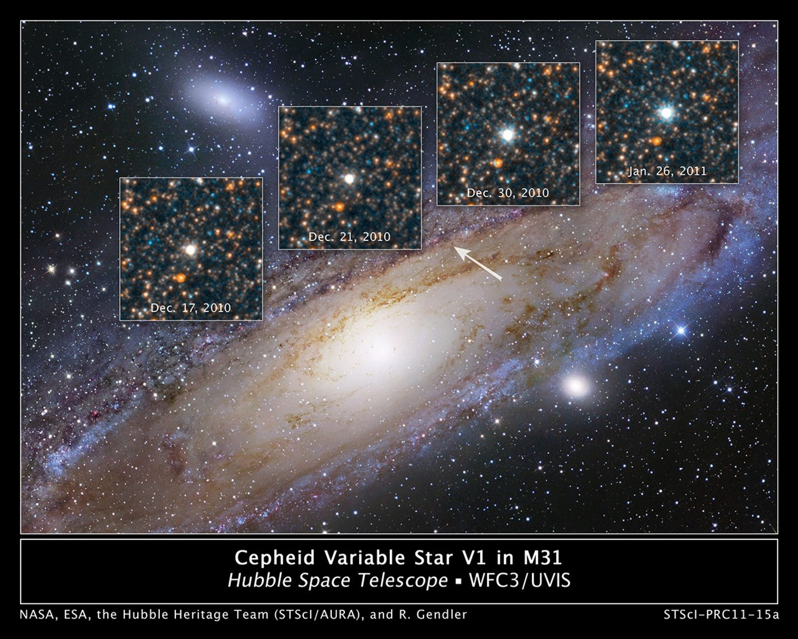 Esempio di stella variabile nella Galassia di Andromeda. Le variazioni di luminosità della stella, in questo caso una variabile di tipo Cefeide, sono catturate dal telescopio spaziale Hubble in giorni diversi, come si vede nei quattro riquadri. Crediti: Nasa, Esa, Hubble Heritage Project, Robert Gendler