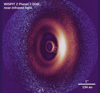 Scoperto nell’ambito di un progetto di ricerca quinquennale volto a stabilire se i giganti gassosi con orbite larghe siano più comuni attorno a stelle giovani o vecchie, Wispit 2b è un baby super-Giove che si stima stia accrescendo massa a un tasso annuo di circa 4 milioni di miliardi di tonnellate, pari a due trilionesimi della massa del Sole. Il pianeta si troverebbe a circa 54 unità astronomiche dalla stella madre, il che, nel Sistema solare, lo collocherebbe ben oltre l’orbita di Nettuno, attorno al bordo esterno della Fascia di Kuiper.