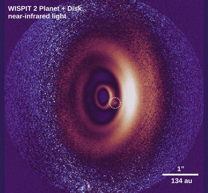 Un’altra immagine del disco circumstellare di Wispit 2. Cerchiato in bianco, il baby pianeta scoperto all’interno di una lacuna del disco. Crediti: C. Ginski/R. van Capelleveen et al.