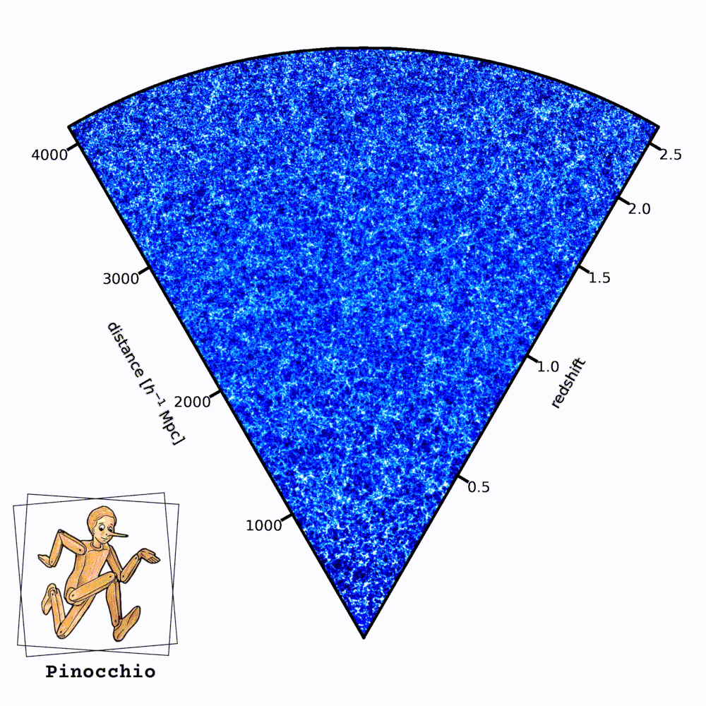 «Di solito una simulazione prende una scatola cubica (un pezzo di universo a forma di cubo, ndr) e la fa evolvere nel tempo. L’output di una simulazione è lo stato di tutte le particelle a un certo istante, per tanti istanti di tempo. Quando noi però osserviamo l’universo, noi lo osserviamo in un modo un pochino particolare: siamo in un fissi in un punto e più guardiamo lontano, più andiamo indietro nel tempo. Quindi lo osserviamo nel cosiddetto “cono-luce passato”, che è un concetto della relatività speciale e si riferisce a un diagramma spaziotemporale. Mentre l’output logico di una simulazione è lo stato delle particelle a un certo istante, l’output più naturale per il modo con cui noi osserviamo l’universo è il cono-luce passato: vorrei avere la posizione delle particelle, o ancora meglio degli aloni di materia oscura, nell’istante in cui sono visibili. Un output che è a tempi diversi, a distanze diverse dall’osservatore. La cosa comoda di Pinocchio è che questa operazione, che di solito per le simulazioni richiede un’elaborazione molto pesante, viene fatta dal codice stesso, quindi l’output del codice è direttamente un catalogo di aloni di materia oscura nel cono-luce passato. All’istante giusto in cui noi lo possiamo osservare. Questa caratteristica rende questo campione di simulazioni che abbiamo prodotto unico, perché è la più grande collezione di simulazioni di aloni nel cono-luce passato che sia mai stata prodotta».