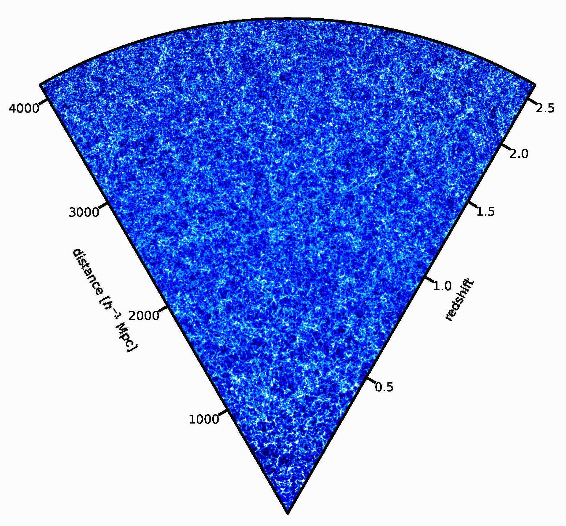 Visualizzazione di una delle simulazioni del cielo di Euclid realizzate con il codice Pinocchio. Le regioni più chiare rappresentano porzioni più dense della rete cosmica. L’osservatore si trova nell’angolo in basso. Crediti: P. Monaco