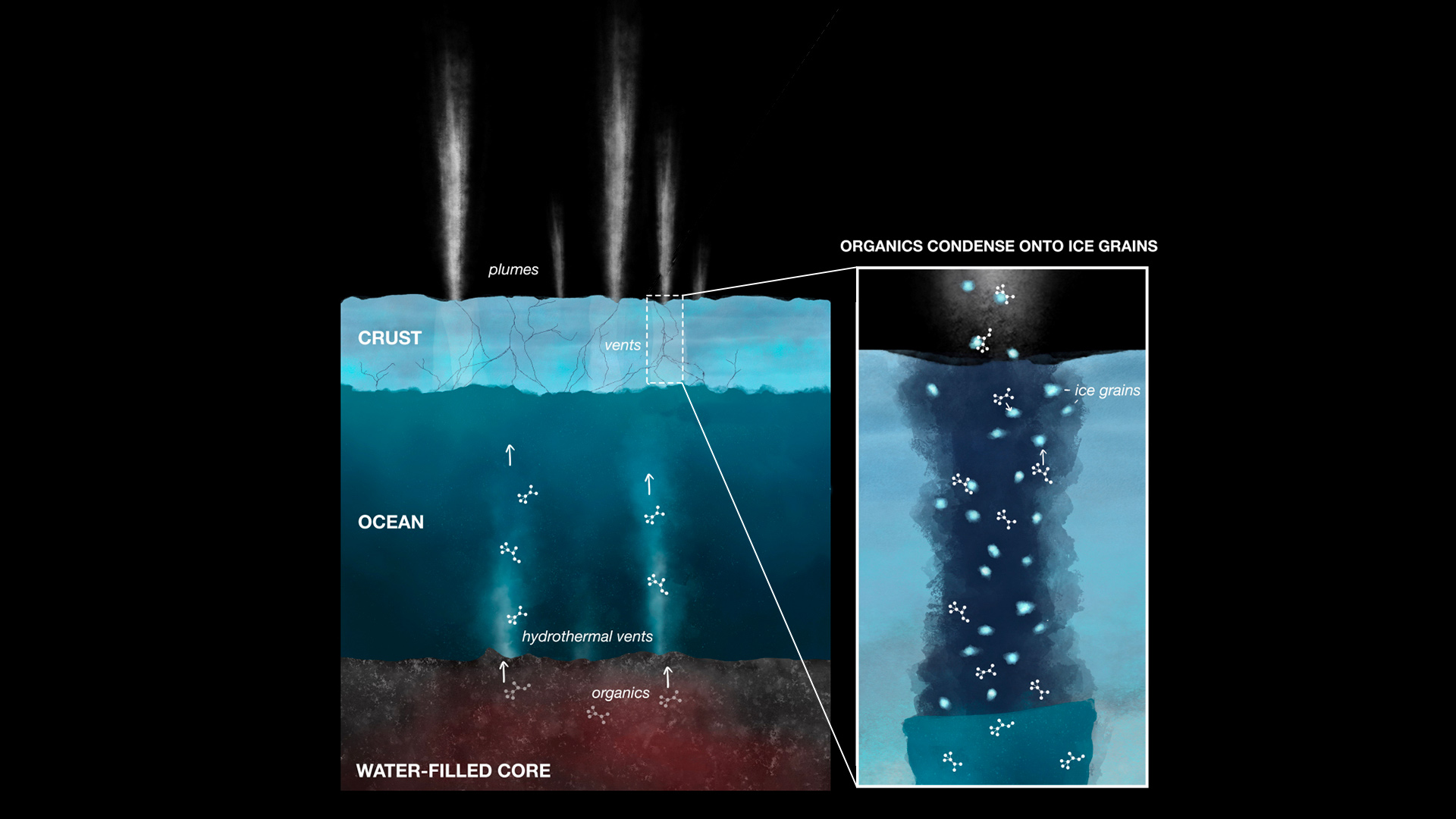 Illustrazione artistica che mostra la stratigrafia di Encelado e il probabile processo che porta all’emissione di pennacchi dalle fessurazioni. Crediti: Nasa/Jpl-Caltech