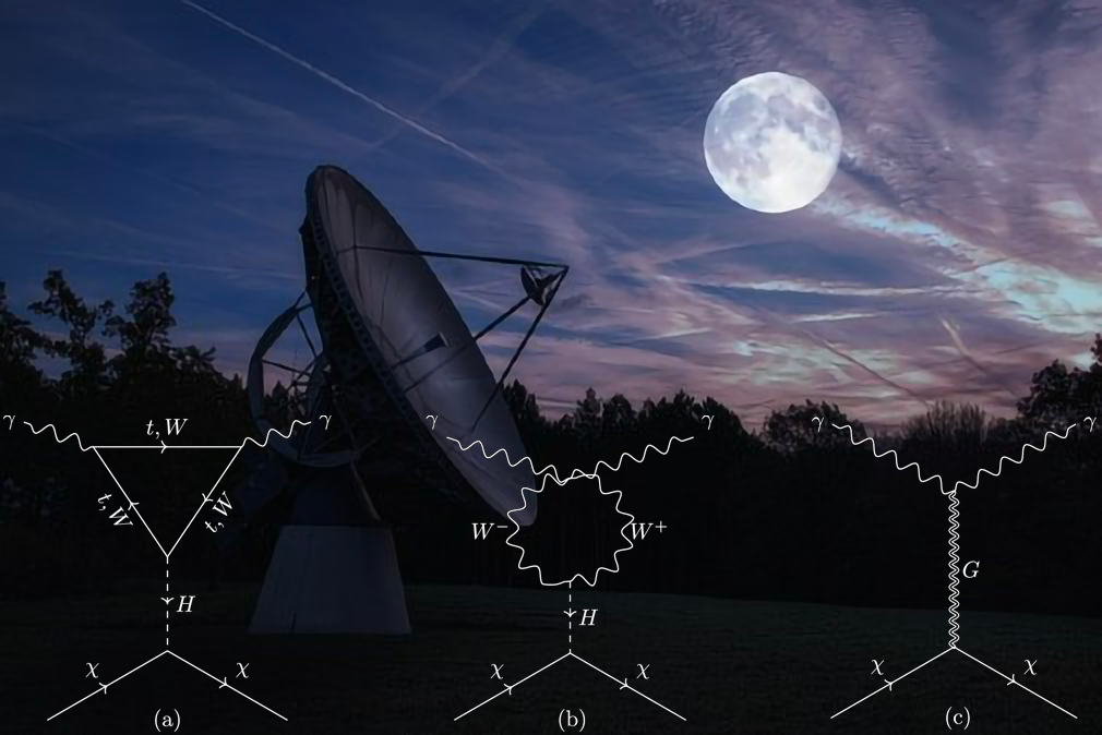 In basso tutti i possibili diagrammi per lo scattering materia oscura-fotone propagato dal bosone di Higgs e dal gravitone nel gauge unitario. Fonte: A. Acar et al. PhysLettB, 2025. Crediti per la foto sullo sfondo: University of York