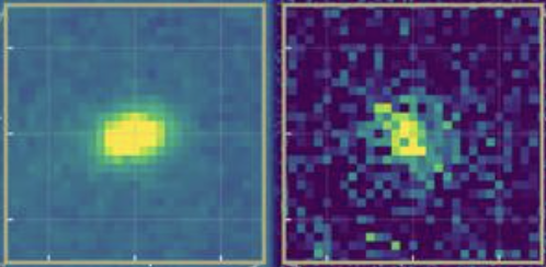 La cometa 3I/Atlas vista nella luce visibile (a sinistra) e ultravioletta (a destra). Nell’immagine a destra si nota l’emissione dell’idrossile (OH) che traccia vapor d’acqua rilasciato dalla cometa. Le immagini sono state ottenute il 31 luglio e il 19 agosto 2025. Nell’immagine del 19 agosto l’emissione di OH è più pronunciata. Crediti: Dennis Bodewits, Auburn University