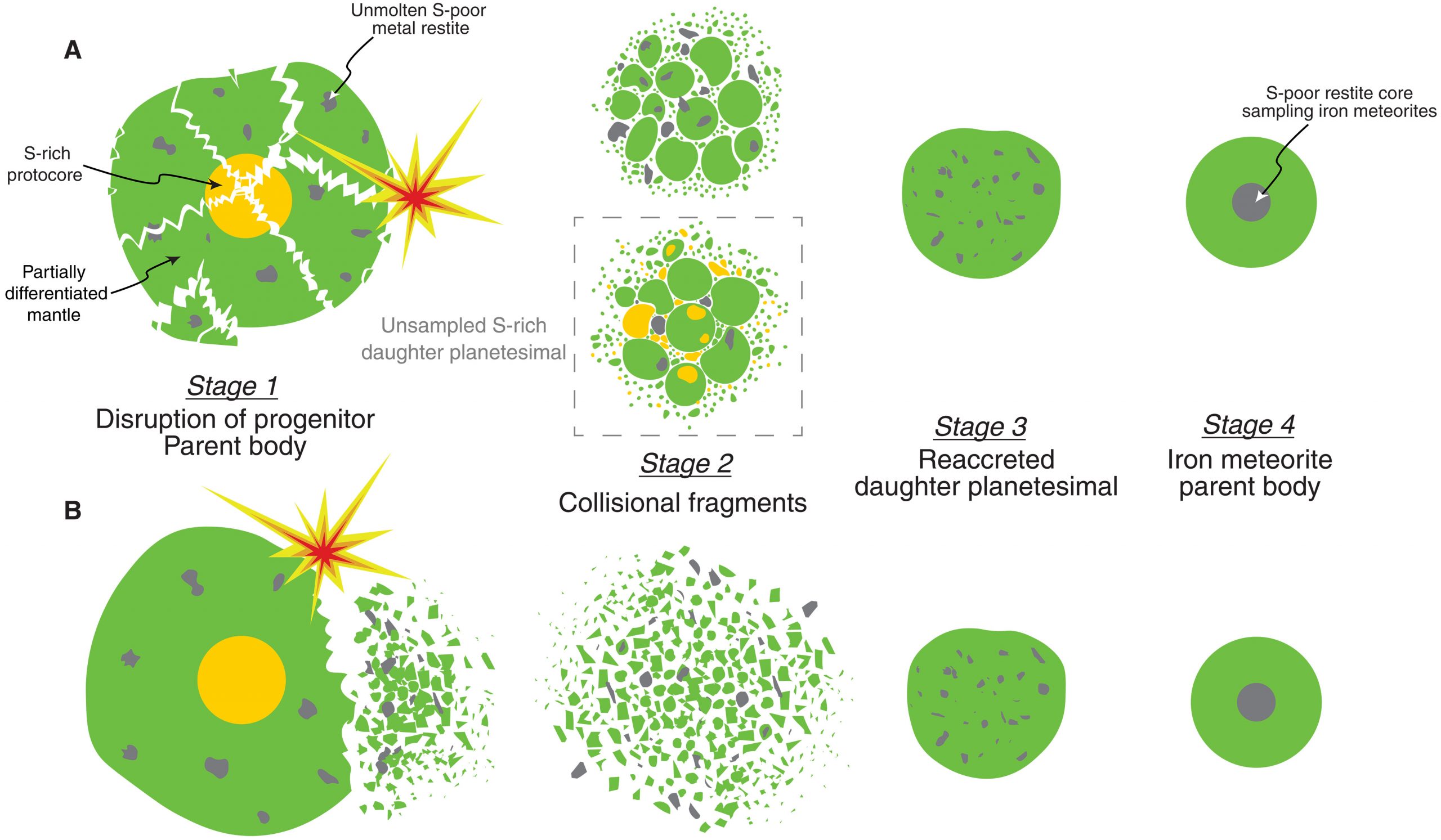 Rappresentazione schematica dei meccanismi proposti per la formazione dei meteoriti ferrosi di tipo IID, IIF, IIIF e IVB in seguito alla distruzione per collisione dei loro corpi progenitori. Le righe (A) e (B) raffigurano rispettivamente distruzioni causate da impatti ad alta energia e collisioni di tipo “hit-and-run”. Crediti: Damanveer S Grewal et al., Science Advances, 2025