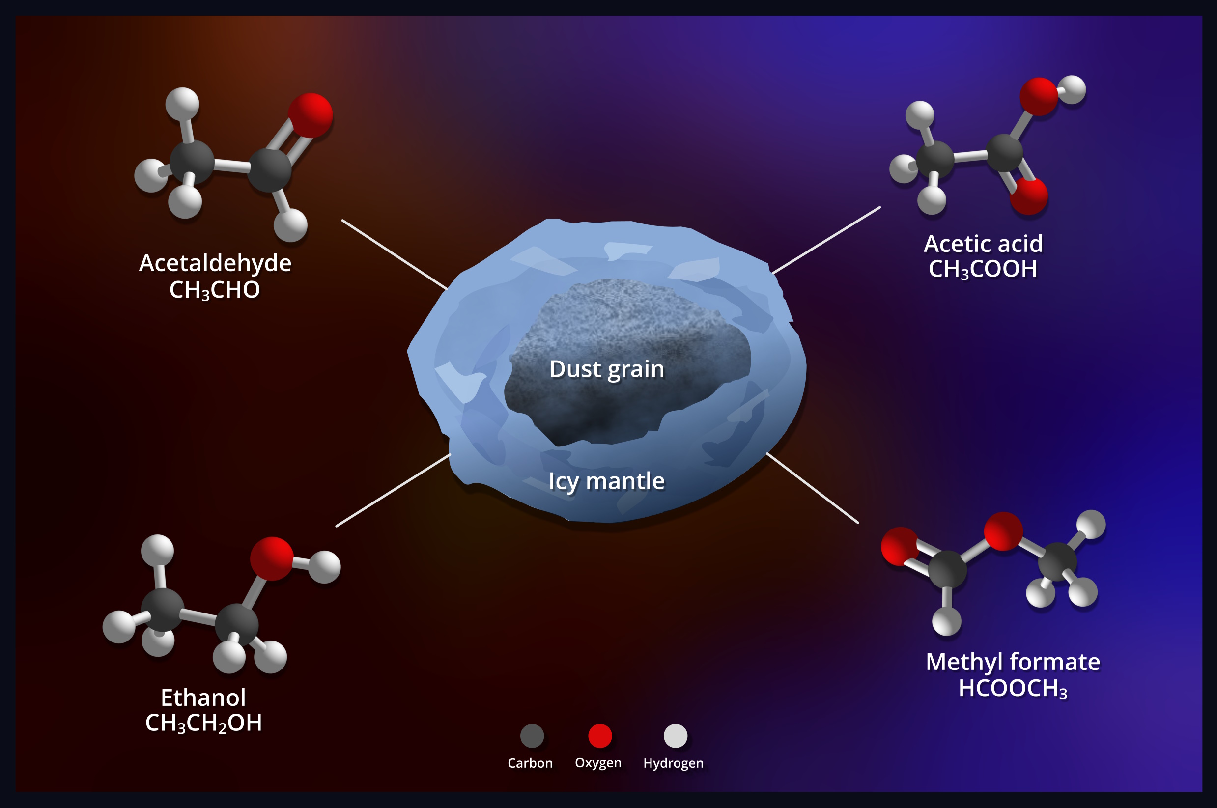 Un diagramma che mostra le molecole organiche complesse (Com) rilevate sui granelli di polvere ghiacciata attorno a ST6: acetaldeide, acido acetico, etanolo e formiato di metile. Crediti: Nasa Goddard Space Flight Center