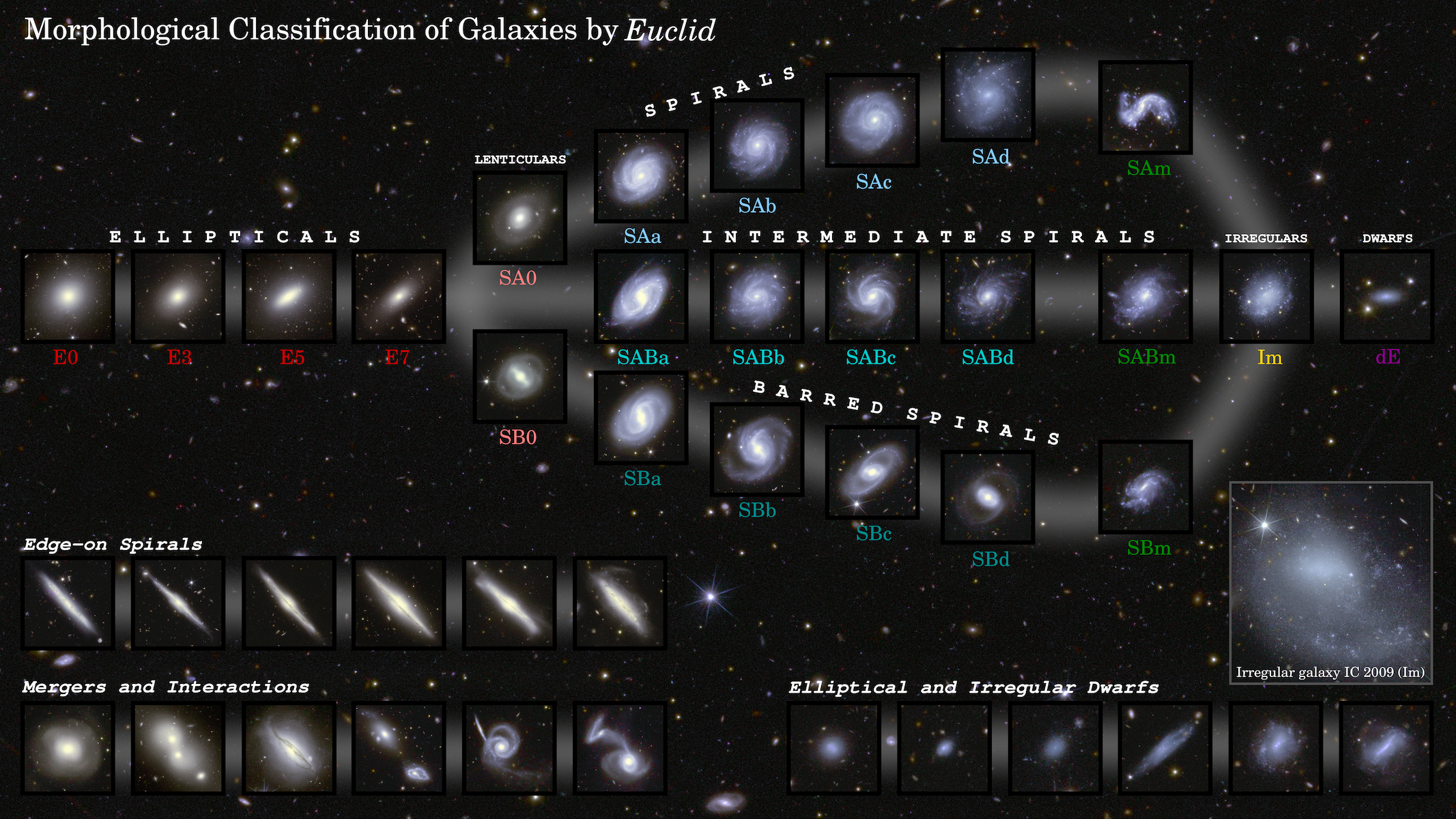 La sequenza morfologica delle galassie, con le immagini del telescopio spaziale Euclid (cliccare per ingrandire; una versione senza annotazioni è disponibile qui). Crediti: Diagramma: Esa/Euclid/Euclid Consortium/Nasa, Diagram by J.-C. Cuillandre, L. Quilley, F. Marleau. Images alone: Esa/Euclid/Euclid Consortium/Nasa, image processing by J.-C. Cuillandre, E. Bertin, G. Anselmi