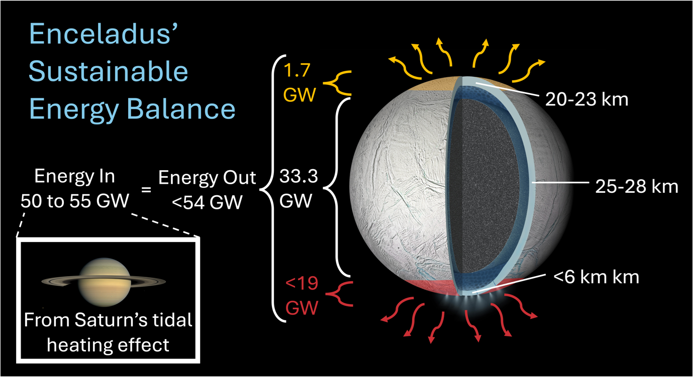 Estendendo questo valore a tutto Encelado, la perdita di calore per conduzione (dall’acqua liquida al ghiaccio della crosta) ammonterebbe a circa 35 gigawatt: più o meno equivalente alla produzione di oltre 66 milioni di pannelli solari (con una potenza di 530 watt) o 10500 turbine eoliche (con una potenza di 3,4 megawatt). E se a questo si aggiunge il calore che, secondo le stime precedenti, fuoriesce dal polo sud attivo di Encelado, la perdita di calore totale sale a 54 gigawatt: una cifra che corrisponde quasi esattamente al calore immesso dalle forze di marea.